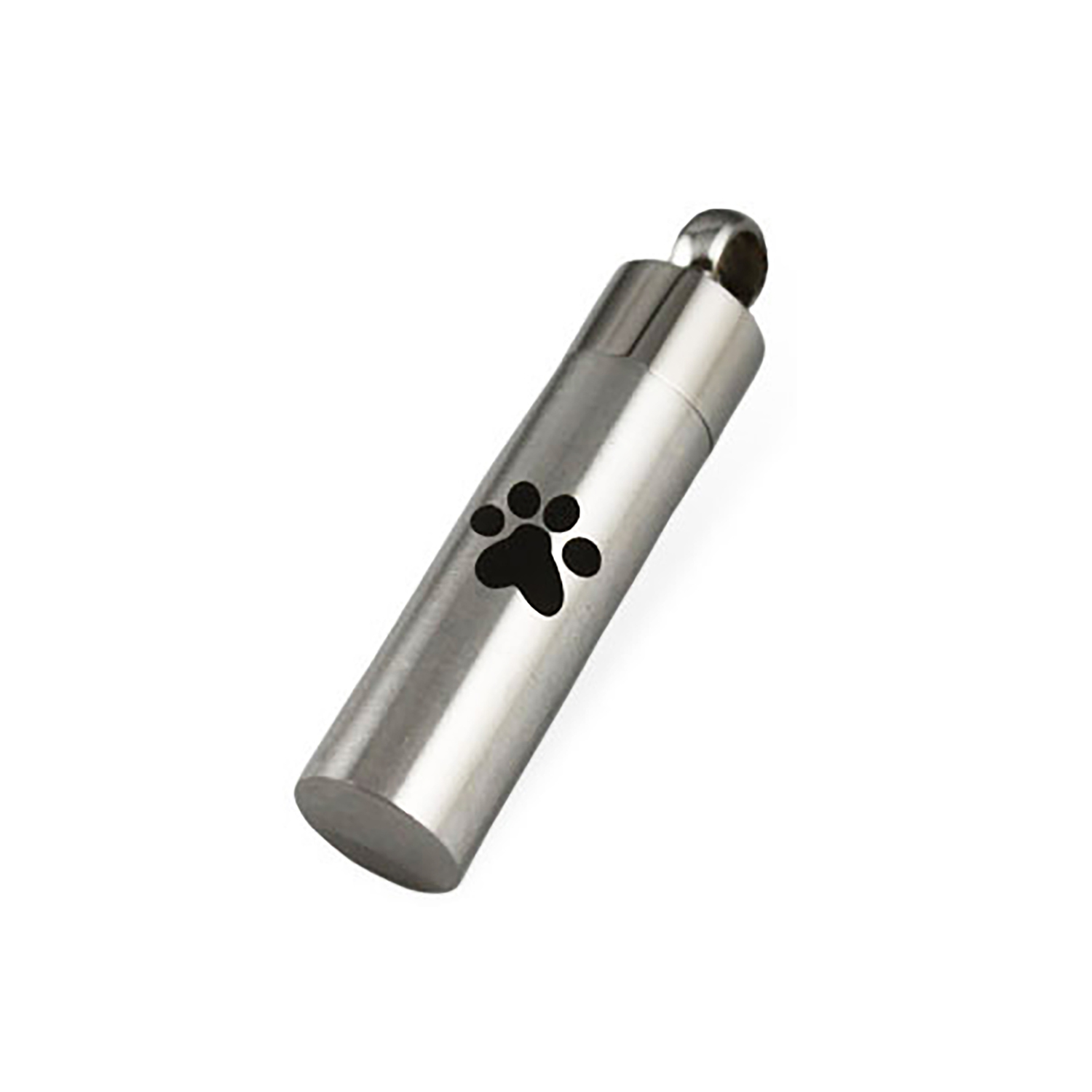 Our Paw Print Cylinder Pendant is a special way to hold a bit of your pet’s cremains. The stainless steel pendant features a paw print on the front and can be attached to either a key ring or a necklace chain. The top unscrews and opens wide for easy placement of cremains. Please Note: Chain not included. We recommend sealing the compartment closed after placing in the pet’s remains with clear super glue.
